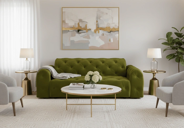 • Tiefe Steppungen mit dekorativen Knöpfen bilden elegante, rautenförmige Vertiefungen auf der Polsteroberfläche.