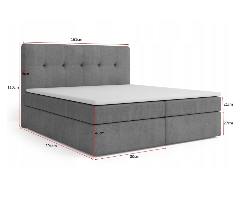 HOLLY ist die perfekte Wahl für alle, die Komfort, Funktionalität und Eleganz in einem Möbelstück suchen. Die großzügige Liegefläche von 160x200 cm bietet ausreichend Platz für erholsamen Schlaf, unabhängig von der bevorzugten Schlafposition. Zwei geräumige Schubladen unter dem Möbelstück schaffen zusätzlichen Stauraum für Bettwäsche oder andere Gegenstände, was eine effiziente Nutzung des Platzes im Schlafzimmer ermöglicht. Der strapazierfähige und zugleich weiche Stoffbezug mit leichtem Glanz verleiht dem Möbelstück eine Ausstrahlung. Durch das hochwertige Design fügt sich HOLLY nahtlos in moderne und elegante Innenräume ein und verleiht ihnen eine besondere Note. Die im Lieferumfang enthaltene, Auflage passt sich dem Körper optimal an und sorgt für hohen Schlafkomfort. Ergonomische Eigenschaften fördern die Regeneration und unterstützen gesunden Schlaf. Dank der Möglichkeit, Farbe und Material individuell auszuwählen, lässt sich das Möbelstück perfekt an den eigenen Geschmack und den Stil des Raumes anpassen. Diese Flexibilität macht HOLLY zur idealen Ergänzung sowohl in klassischen als auch in modernen Einrichtungsstilen. Die robuste Konstruktion aus langlebigen Materialien sorgt für langfristige Stabilität. Der einfache Aufbau wird durch die mitgelieferte Anleitung erleichtert, und die Lieferung in praktischen Paketen vereinfacht den Transport. HOLLY vereint Funktionalität, Stil und Komfort und schafft so einen stilvollen Ort für erholsame Nächte.
