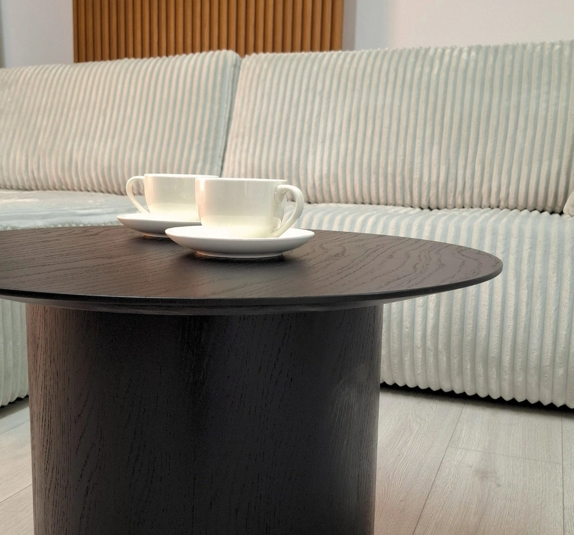 Dank seiner kompakten Maße von 60 × 40 cm eignet sich der Tisch ideal für das Wohnzimmer sowie für kleinere Räume – neben dem Ecksofa, der Couch oder dem Sessel. Die runde Tischplatte auf einer zylindrischen Basis bildet eine harmonische Einheit und unterstreicht den modernen, organischen Charakter des Möbelstücks.