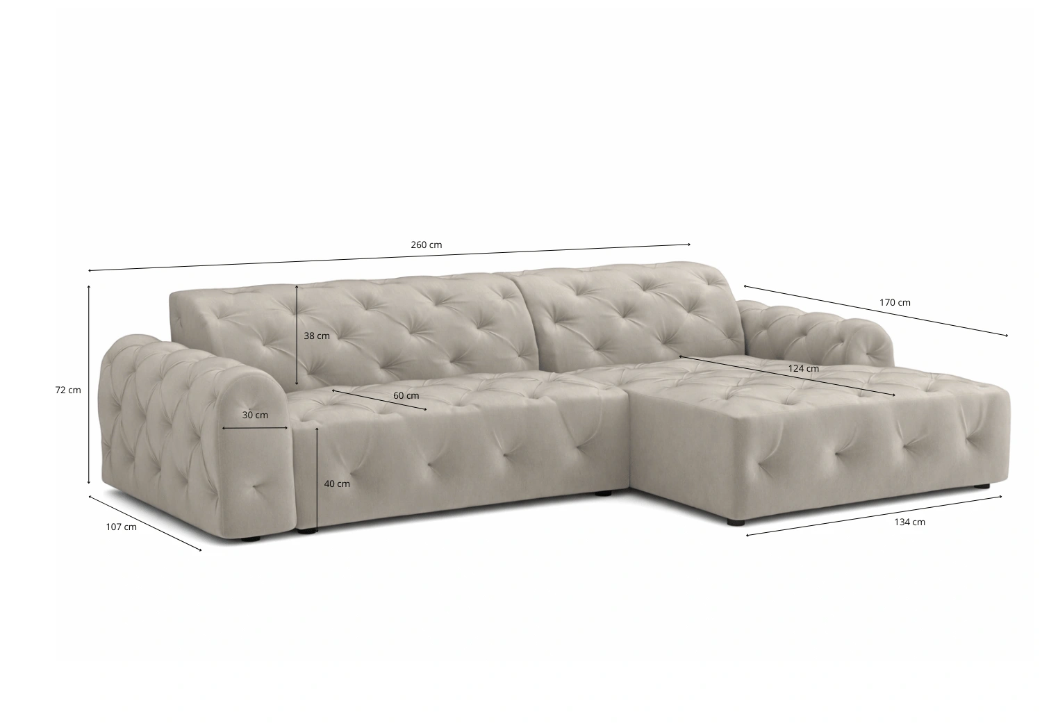 Das Ecksofa Candi vereint modernes Design mit einem Hauch von klassischer Eleganz. Die charakteristische Chesterfield-Knopfheftung und die tiefen Polster verleihen dem Sofa einen n Look, der anspruchsvolle Innenräume perfekt ergänzt. Mit einer Breite von 260 cm und einer Tiefe von 170 cm bietet die L-Form des Sofas viel Platz für die ganze Familie oder für Gäste, ohne dabei zu viel Raum einzunehmen – ideal für kleinere Wohnungen.