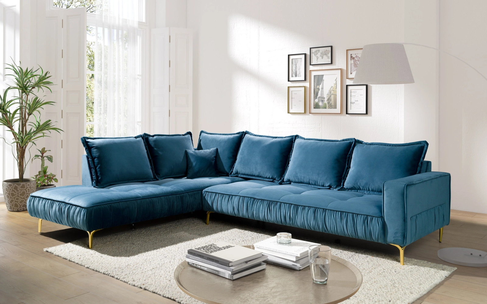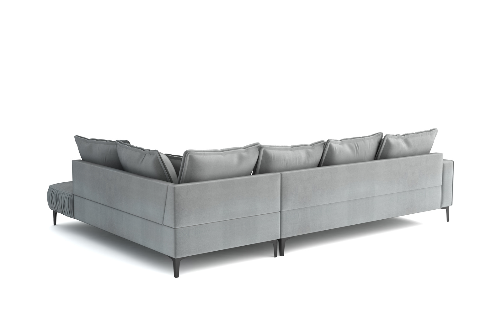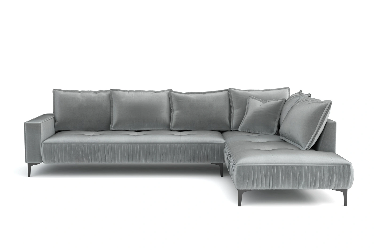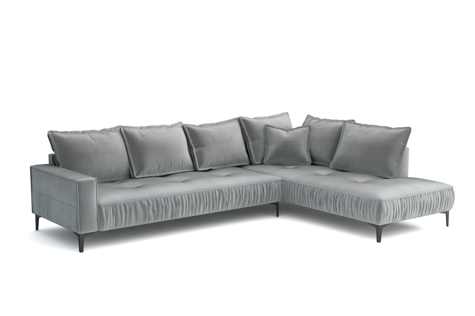 Das Oscar L-förmige Ecksofa bringt modernen Stil und höchsten Komfort in Ihr Wohnzimmer. Der weiche, strapazierfähige Samtstoff schafft eine warme und einladende Atmosphäre, während die großzügigen Maße für ausreichend Platz sorgen. Dank losen Rückenkissen lässt sich das Sofa individuell anpassen, um maximalen Komfort zu gewährleisten. Die stabile Konstruktion aus einem Holzrahmen und robusten Metallbeinen macht das Sofa langlebig und sicher, perfekt für den täglichen Gebrauch.