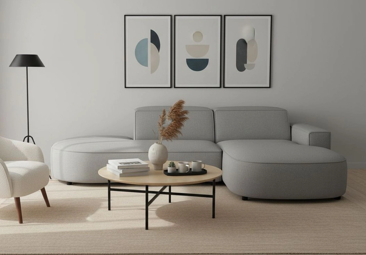 • Modernes Design: Stilvoller grauer Stoffbezug und abgerundete Formen, die sich harmonisch in jedes Interieur einfügen.