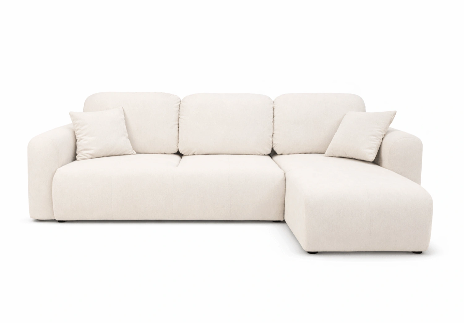 Die Ecksofa UNO zeichnet sich durch eine moderne, minimalistische Silhouette sowie sanft gerundete Linien aus, die ihr einen besonders gemütlichen Charakter verleihen. Die dezente Form fügt sich perfekt in aktuelle Einrichtungstrends ein – von modern und skandinavisch bis hin zu Japandi oder Soft Loft. Weiche Rückenkissen unterstreichen die Eleganz und die optische Leichtigkeit des Sofas.