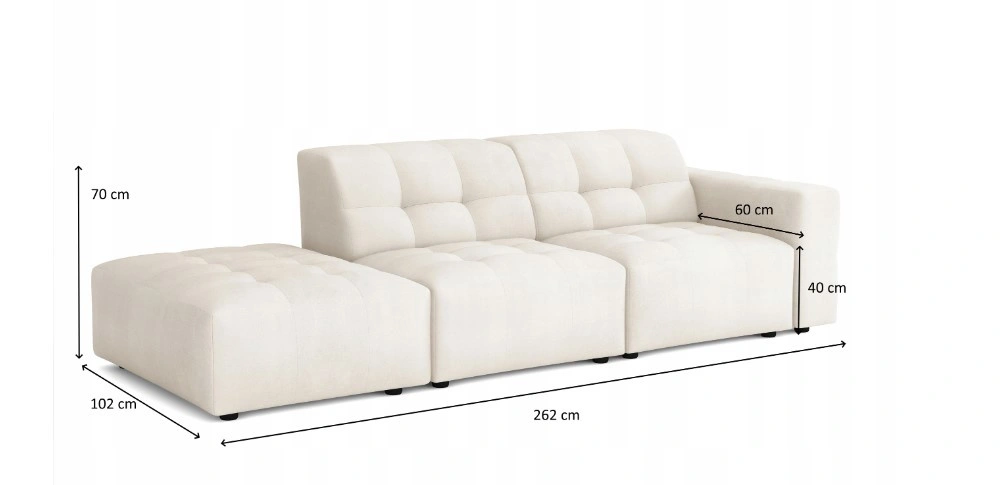Das modulare Sofa mit den Maßen 262x102x70 cm bietet maximale Flexibilität und Komfort für jedes Wohnzimmer. Dank des modularen Designs können die Sofa-Elemente nach Belieben neu arrangiert werden, sodass Sie Ihren idealen Sitzbereich gestalten können. Ob für entspannte Abende mit der Familie oder gesellige Treffen mit Freunden – das Sofa lässt sich perfekt an jede Situation anpassen.