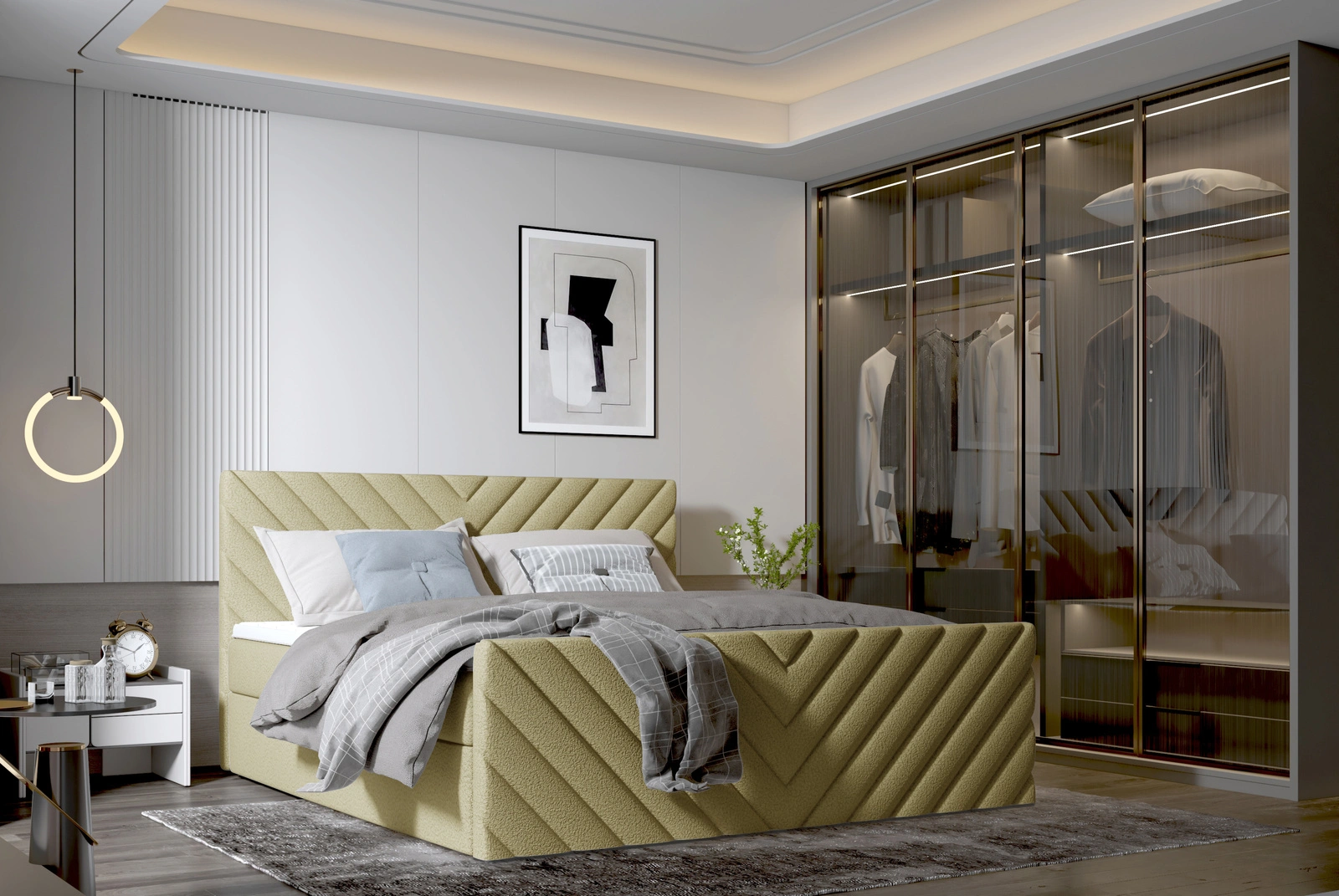 Das großzügige Polsterbett 200x200 cm vereint stilvolles Design mit funktionalem Stauraum und hohem Komfort – perfekt für anspruchsvolle Schlafzimmer. Der Samtbezug, das weich gepolsterte Kopfteil und Fußteil mit Rautensteppung sowie der versteckte Stauraum machen dieses Bett zu einem absoluten Highlight.