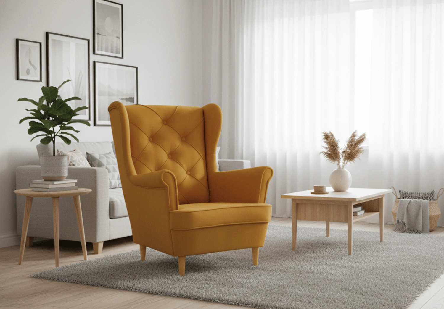 - Massive Buchenholzfüße: Die Füße aus massivem Buchenholz verleihen dem Sessel Stabilität und einen natürlichen skandinavischen Look, der sich perfekt in moderne und klassische Einrichtungen einfügt.