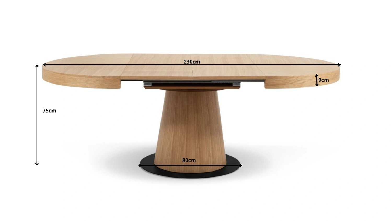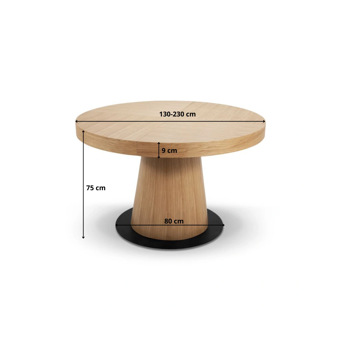 Der runde Ausziehtisch T74 überzeugt mit seiner eleganten Tischplatte aus MDF, die mit natürlichem Eichenfurnier veredelt ist, und einer stabilen Mittelsäule