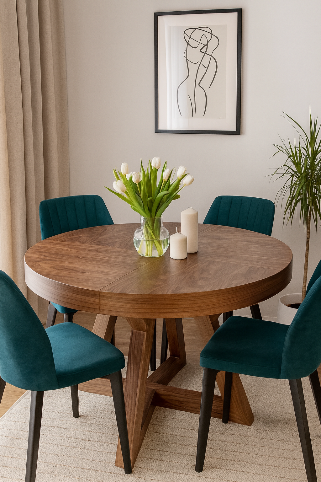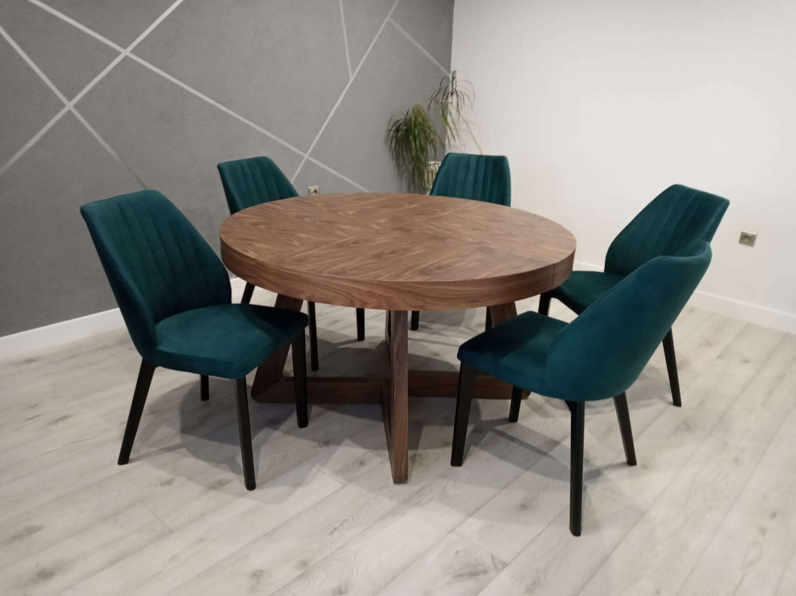 Der runde, ausziehbare Tisch T40 vereint zeitloses Design mit hoher Funktionalität. Die Tischplatte aus MDF mit natürlicher Eichenfurnier-Oberfläche überzeugt durch eine außergewöhnliche Maserung, während die stabilen, kreuzförmig profilierten Beine aus Massivholz für eine elegante Optik sorgen. Dank des hochwertigen Auszugssystems der Firma POTTKER lässt sich der Tisch auf eine Gesamtlänge von 230 cm erweitern, was ihn ideal für größere Anlässe macht. Der Tisch wird in festgelegten Größen gefertigt und kann nicht individuell angepasst werden – eine perfekte Kombination aus Ästhetik und Funktionalität.