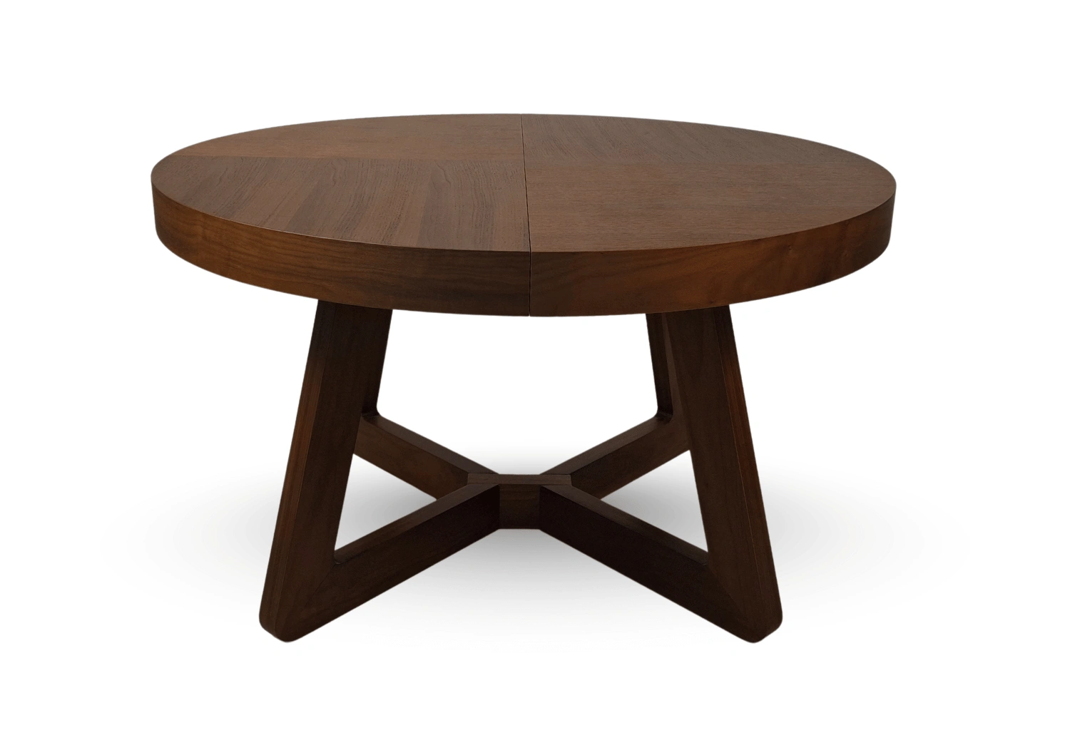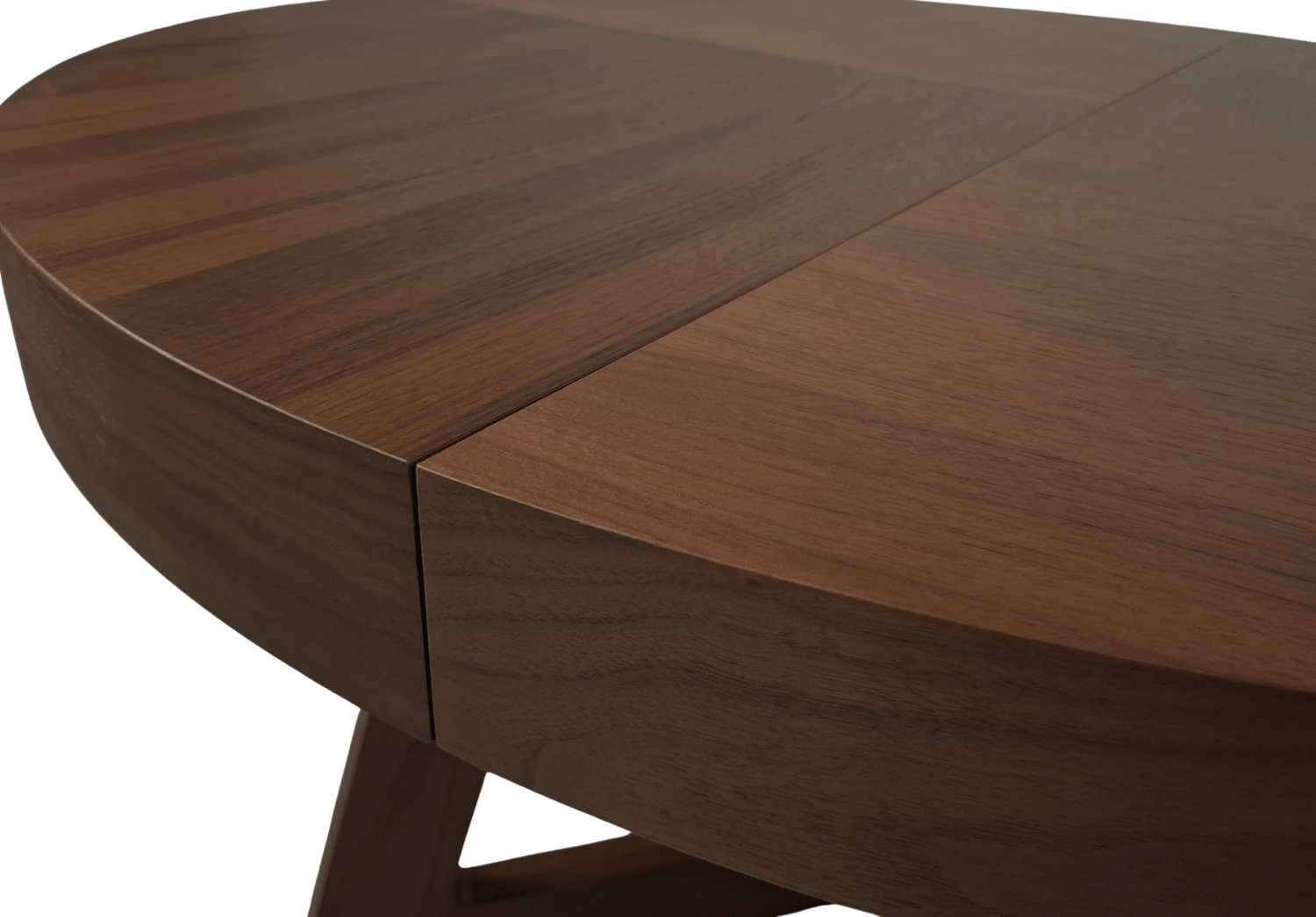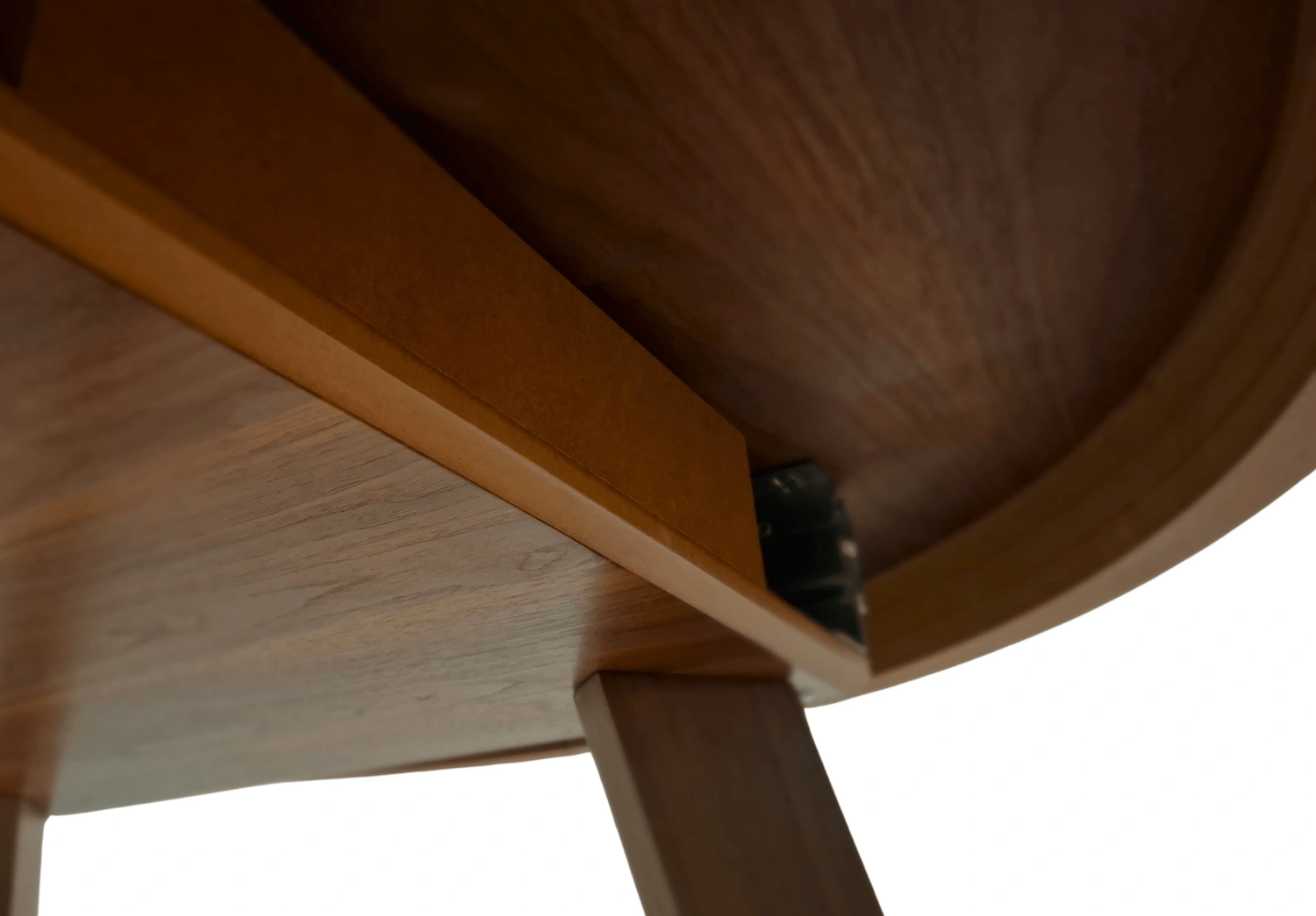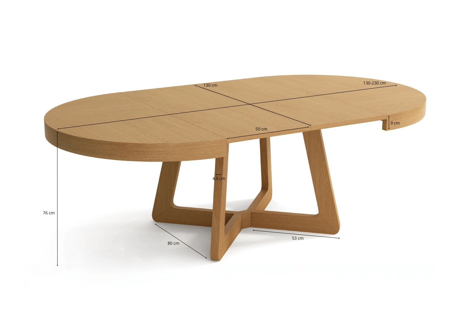 Der runde, ausziehbare Tisch T40 vereint zeitloses Design mit hoher Funktionalität. Die Tischplatte aus MDF mit natürlicher Eichenfurnier-Oberfläche überzeugt durch eine außergewöhnliche Maserung, während die stabilen, kreuzförmig profilierten Beine aus Massivholz für eine elegante Optik sorgen. Dank des hochwertigen Auszugssystems der Firma POTTKER lässt sich der Tisch auf eine Gesamtlänge von 230 cm erweitern, was ihn ideal für größere Anlässe macht. Der Tisch wird in festgelegten Größen gefertigt und kann nicht individuell angepasst werden – eine perfekte Kombination aus Ästhetik und Funktionalität.