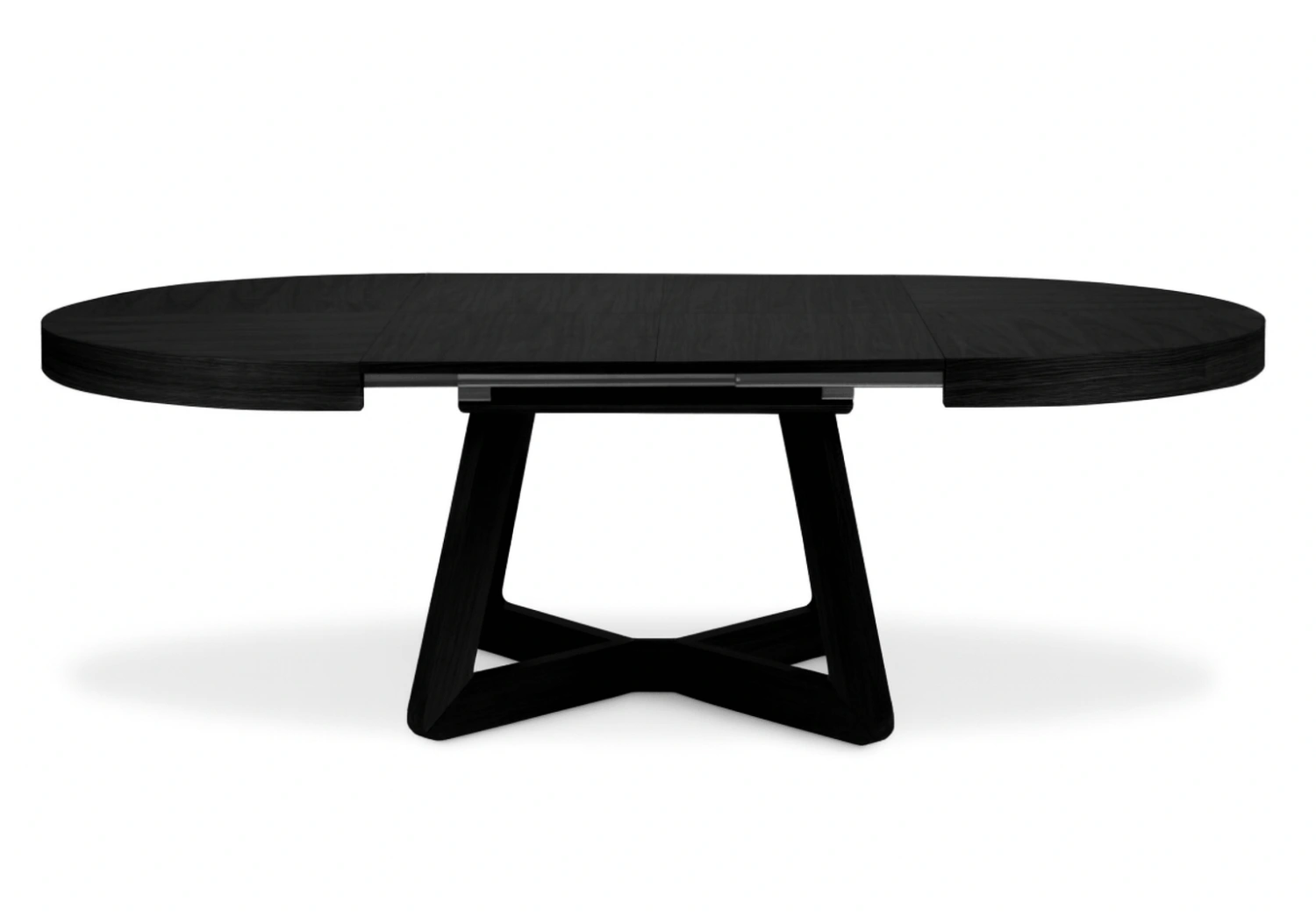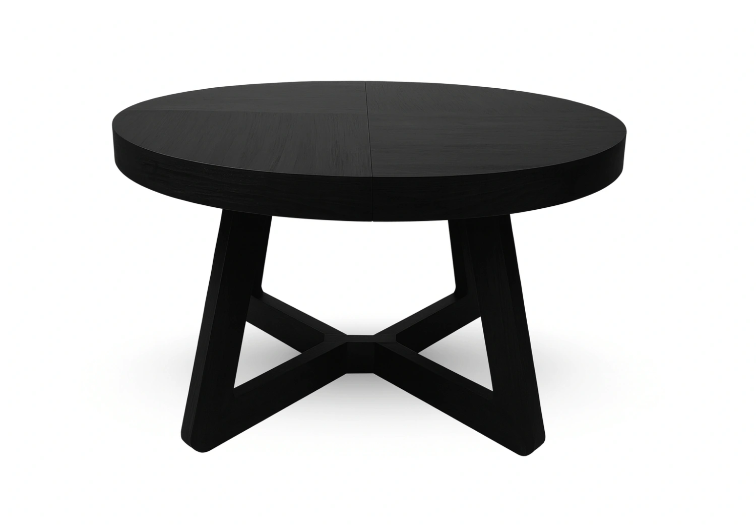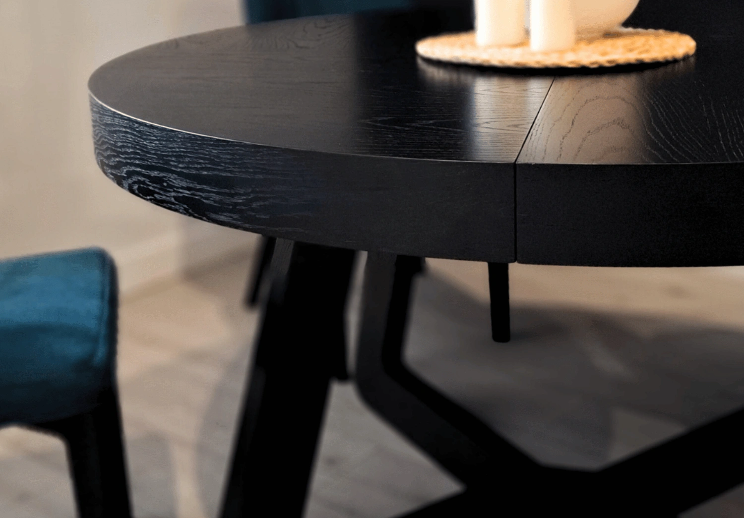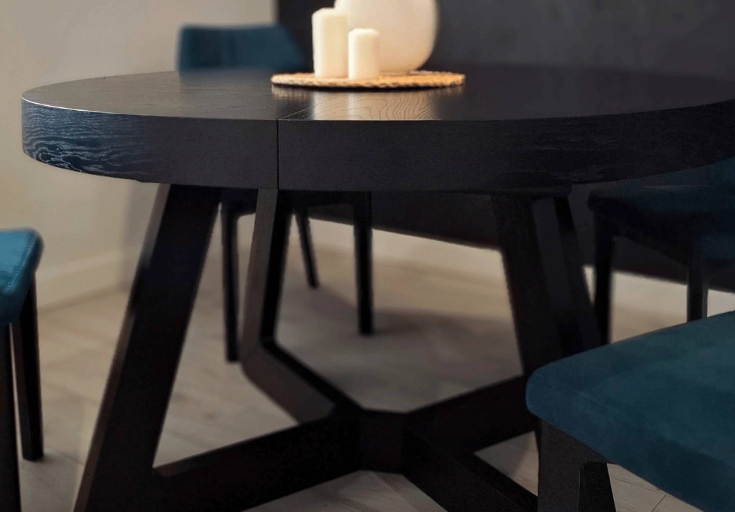 Der runde, ausziehbare Tisch T40 vereint zeitloses Design mit hoher Funktionalität. Die Tischplatte aus MDF mit natürlicher Eichenfurnier-Oberfläche überzeugt durch eine außergewöhnliche Maserung, während die stabilen, kreuzförmig profilierten Beine aus Massivholz für eine elegante Optik sorgen. Dank des hochwertigen Auszugssystems der Firma POTTKER lässt sich der Tisch auf eine Gesamtlänge von 230 cm erweitern, was ihn ideal für größere Anlässe macht. Der Tisch wird in festgelegten Größen gefertigt und kann nicht individuell angepasst werden – eine perfekte Kombination aus Ästhetik und Funktionalität.