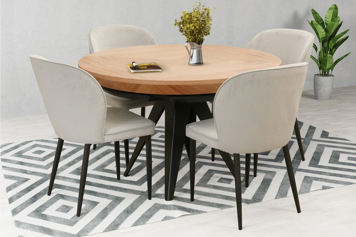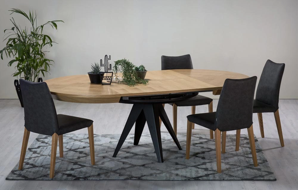 - Funktionale Details: Der Tisch ist mit synchronen Teleskopführungen und zwei unter der Tischplatte verstauten Einlegeplatten ausgestattet.