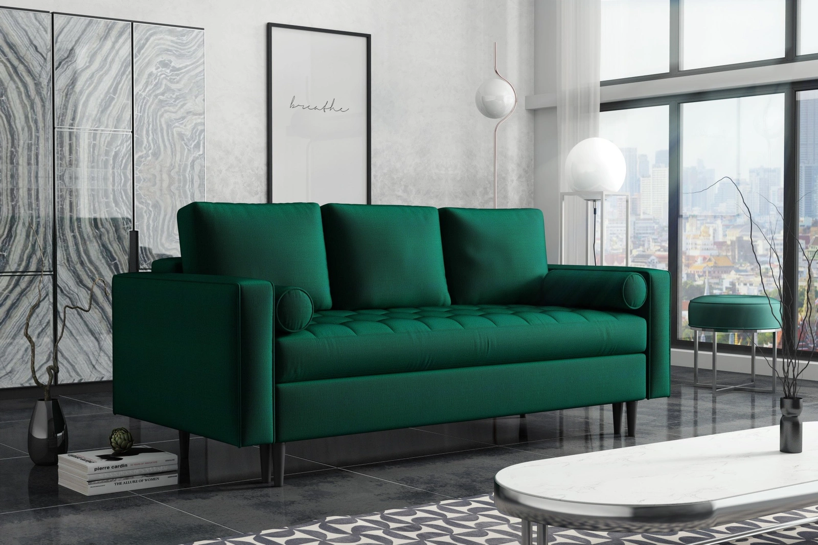 Das Sofa Moris mit Schlaffunktion ist die perfekte Wahl für modernes Wohnen. Mit einer Größe von 225 x 100 x 96 cm passt es ideal in jedes Wohnzimmer oder Gästezimmer. Der robuste Holzrahmen und die Chrombeine sorgen für eine stabile Konstruktion, während der Bezug aus gestepptem Stoff für ein elegantes Aussehen sorgt.