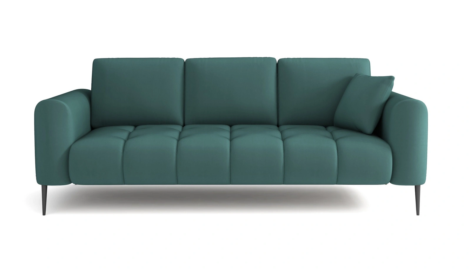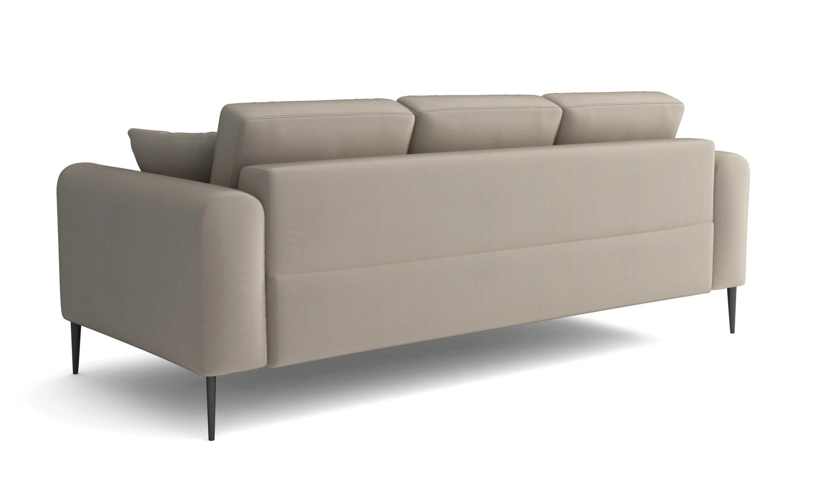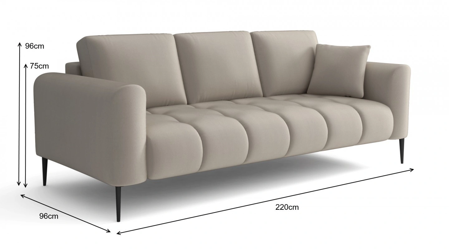 Das Sofa überzeugt durch modernes Design und hohen Komfort. Es handelt sich um ein freistehendes Möbelstück mit eleganten chromierten Füßen in Schwarz oder Gold. Die Sitzfläche ist mit hochwertigem HR-Schaumstoff (10 cm Dicke), Silikon, Wellfedern und Filz ausgestattet, während die Rückenkissen lose und mit Silikon sowie granuliertem HR-Schaumstoff gefüllt sind. Der Rahmen besteht aus einer stabilen Kombination aus Buchenholz und Spanplatte. Obwohl keine Schlaffunktion, kein Stauraum und keine Relax-Funktion integriert sind, bietet das Sofa durch seine hochwertigen Materialien und die Verarbeitung optimalen Sitzkomfort.