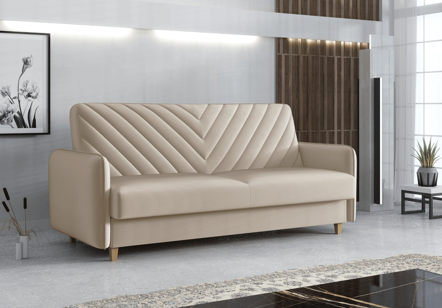 Dieses stilvolle Sofa bietet nicht nur ein ansprechendes Design, sondern auch hohen Komfort. Die vertikal gesteppten Polster sorgen für eine moderne Ästhetik, während die gepolsterten Armlehnen zusätzliche Gemütlichkeit bieten. Ideal für jeden Wohnraum, lässt sich das Sofa leicht in eine Schlafgelegenheit verwandeln.
